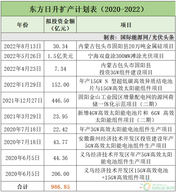 从2020年至今,东方日升已经有九百多亿元的扩产计划。这其中绝大部分资金为东方日升自有资金和自筹资金。