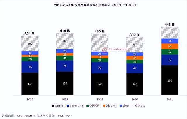 ▲图片来全球5大手机品牌智能手机收入情况,图片来自Counterpoint。