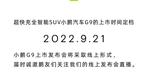 小鹏汽车官微9月9日消息,小鹏G9上市发布会时间定于9月21日。
