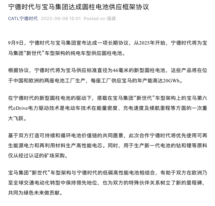 宁德时代官微消息,9月9日,宁德时代与宝马集团宣布达成一项长期协议,从2025年开始,宁德时代将为宝马集团“新世代”车型架构的纯电车型供应圆柱电池。根据协议,宁德时代将为宝马供应标准直径为46毫米的新型圆柱电池,这些产品将在位于中国和欧洲的两座电池工厂生产,每座工厂供应宝马的年产能高达20GWh。