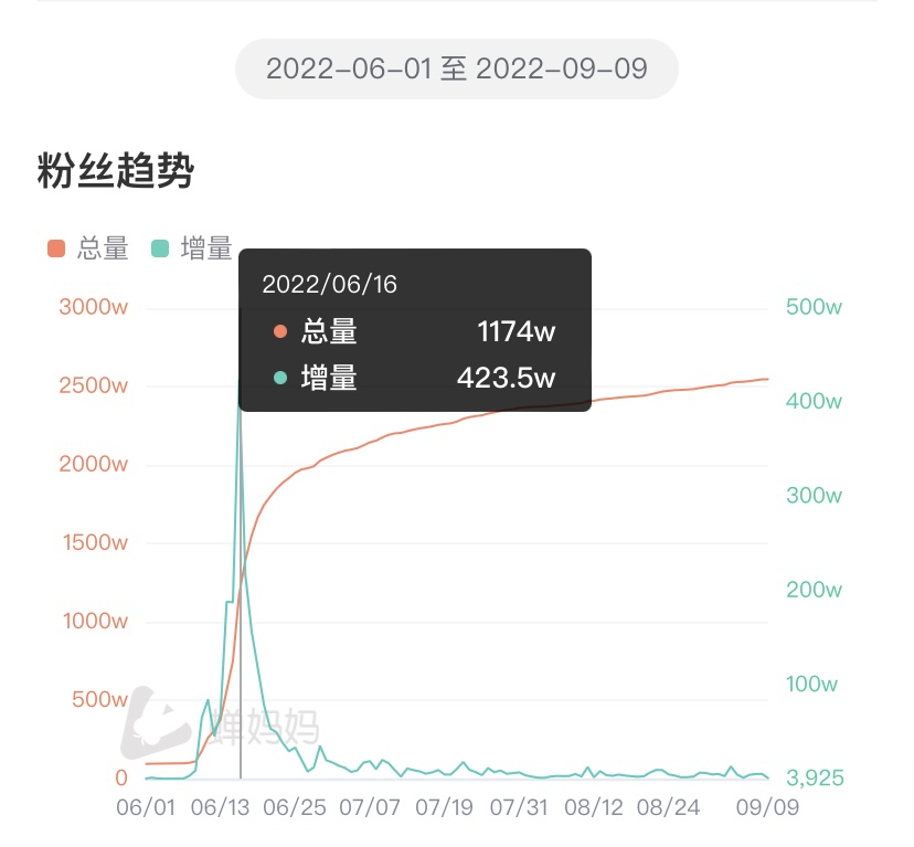 蝉妈妈数据显示,6月8日,东方甄选粉丝破百万;6月16日粉丝增量最多达425.5万人,总粉丝量达到1174万,并于6月29日突破2000万大关。截至9月9月,其粉丝总量仅为2544万人,即两个月过去后,涨粉仅500多万。