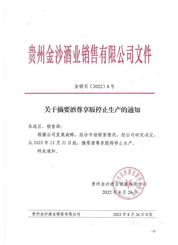 8月26日,贵州金沙酒业销售有限公司发布《关于摘要酒尊享版停止生产的通知》,通知表示,从2022年12月31日起,摘要尊享版将停止生产。业内人士称,这一举动与3月份的两个“暂停”如出一辙,还是在“以退为进”。