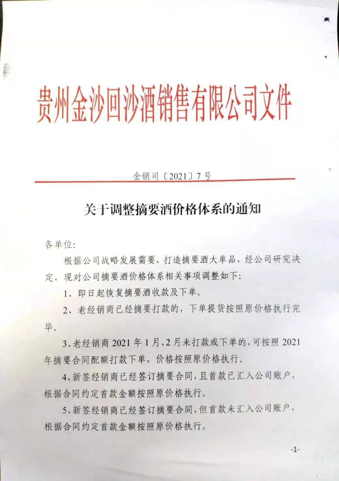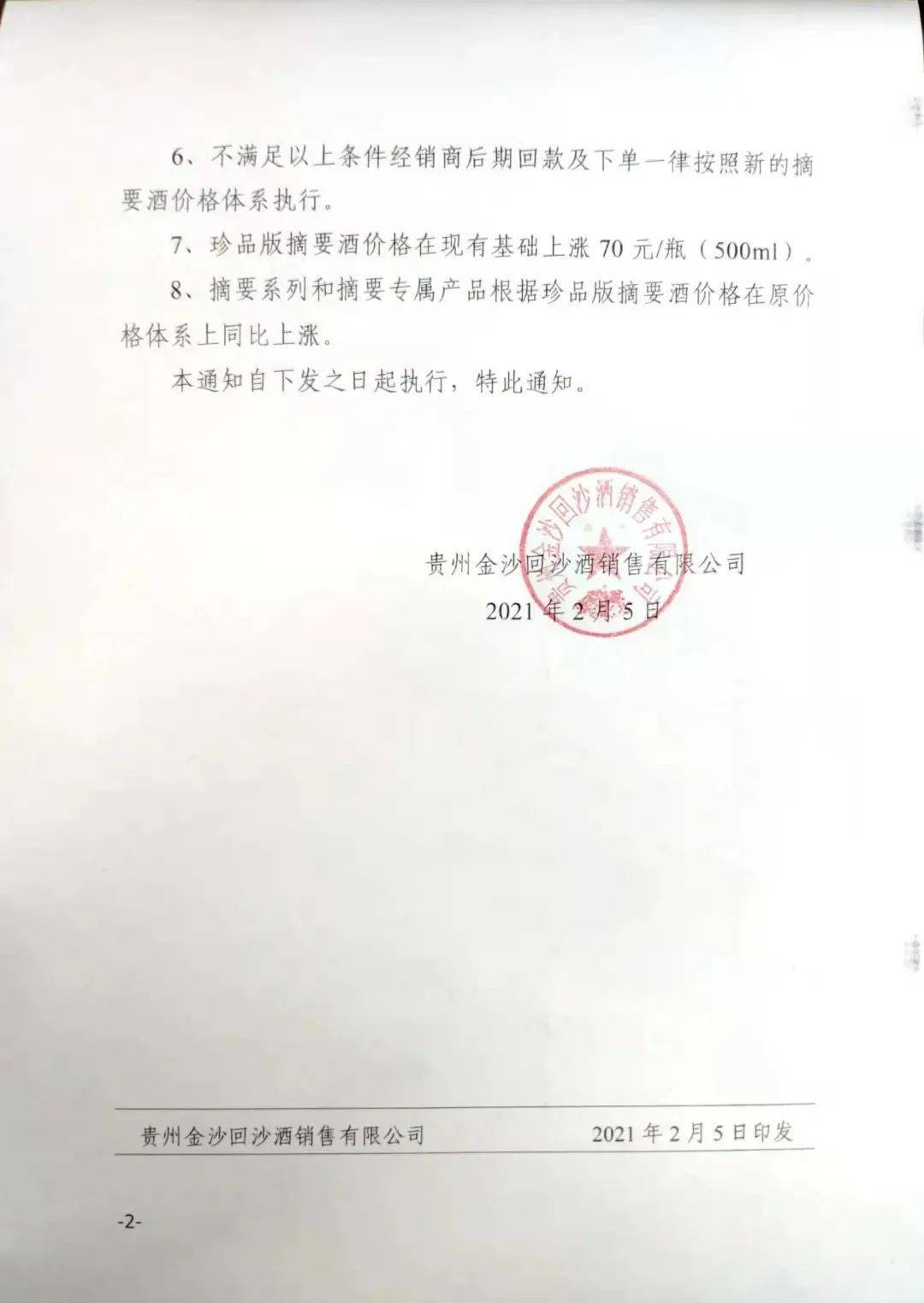 果然,2月5日晚上,贵州金沙回沙酒销售有限公司发布《关于调整摘要酒价格体系的通知》,即日起恢复摘要酒收款及下单并对摘要系列产品调价。其中,珍品版摘要酒价格在现有基础上涨70元/瓶(500ml);摘要系列和摘要专属产品根据珍品版摘要酒价格在原价格体系上同比上涨。