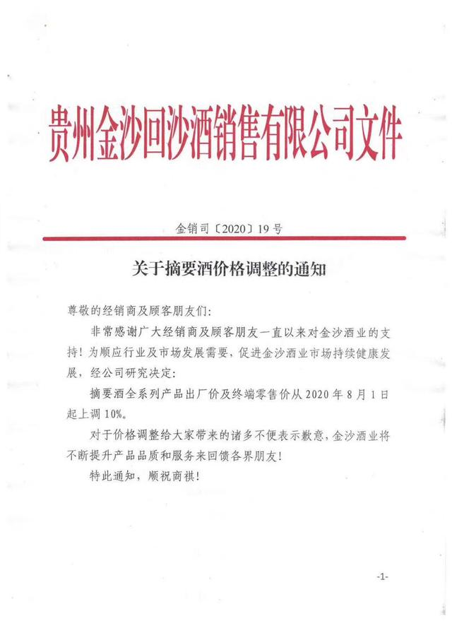 公司研究室注意到,第六次涨价发生在2020年7月。7月21日,贵州金沙回沙酒销售有限公司发文通知,摘要酒全系产品出厂价与终端零售价从2020年8月1日起上调10%。