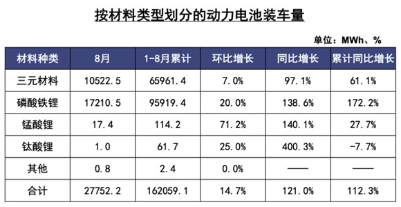 今年以来,磷酸铁锂电池的单月装车量均超过三元电池。今年前8个月,磷酸铁锂电池市占率超过59%,较三元电池高出18个百分点。