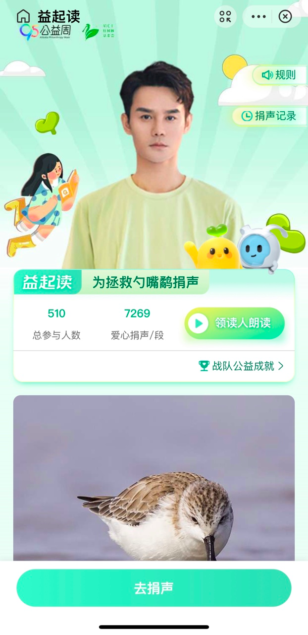 这次活动还邀请了王凯、杨立新、曾黎、阿雅、陈星旭、朱梓潼、周柯宇等演员、歌手、主持人共同进行公益领读,用户可加入任一领读人战队,按要求为受益人朗读。每个公益领读人战队经审核通过的个人捐声段数达到活动设定目标,还可成功在线下通过公益活动实现相应项目落地。