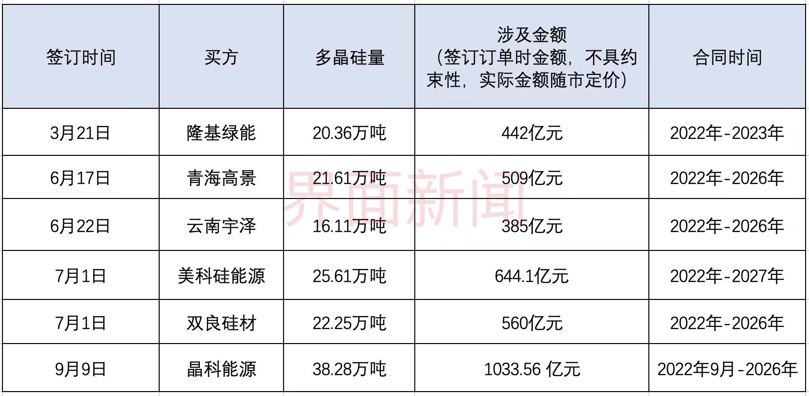 如按照中国有色金属工业协会硅业分会8月31日公布的国内单晶致密料成交均价30.51万元/吨测算,预估合同不含税总金额约1033.56亿元。