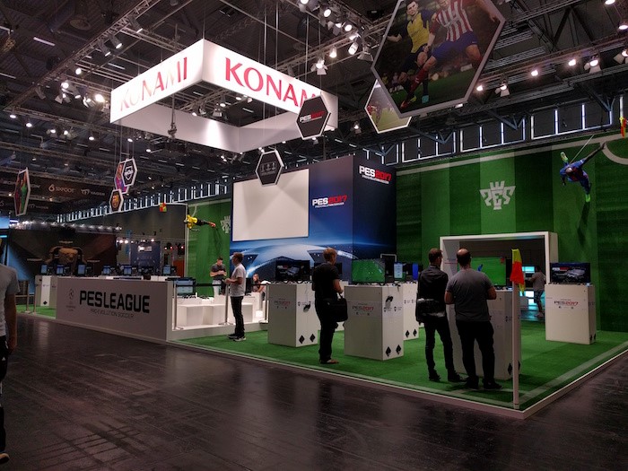 Konami展台,该厂商在科隆最最出人意料之处的就是公布了《合金装备》的新作《合金装备:生存》,然而现场主要展出的游戏是《PES 2017》,并无《合金装备:生存》的踪影。