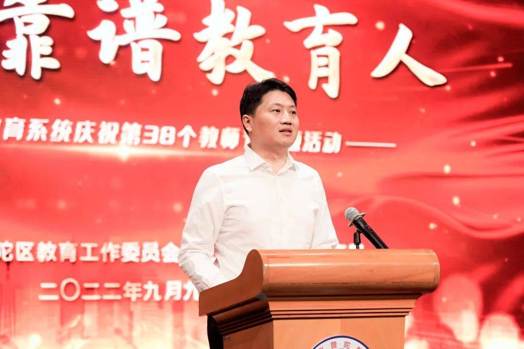 姜冬冬代表区委、区人大、区政府、区政协,向受到表彰的先进集体和先进个人表示热烈祝贺,向全区广大教师和教育工作者致以节日问候。姜冬冬表示,近年来,普陀区牢牢锚定教育强区的目标,坚持教育优先发展、优质发展,交出了一份含金量十足的成绩单。特别是今年,全区教育战线迅速响应区委、区政府号召,自觉投入抗疫大战,为打赢大上海保卫战作出了贡献。他强调,教师是立教之本、兴教之源,全区广大教师要始终牢记习近平总书记做“四有”好老师的嘱托,牢记为党育人、为国育才的使命,全面贯彻党的教育方针,做坚守初心、对党忠诚的模范大先生,做人品如玉、师德高尚的灵魂工程师,做功底扎实、素质过硬的成长引路人,源源不断培育德智体美劳全面发展的社会主义建设者和接班人,让每一个学生都能健康成长、都有人生出彩的机会。全区要大力弘扬优秀教师的先进事迹,大力弘扬尊师重教的良好风尚,让教师真正成为令人向往的职业。各级党委、政府要关心关爱教师队伍,为教师营造更好的从教环境和保障体系,以高质量教师队伍推动普陀教育高质量发展。