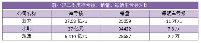 第二季度,小鹏净亏损与蔚来基本持平,达27亿元,同比增长126%,交付量34422辆,每卖出一辆车亏损7.8万;理想二季度的净亏损为6.410亿元,同比增加172.2%,交付量为28687辆,每卖出一辆车亏损2.2万。