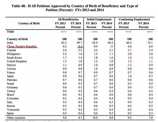 上图为2013-2014财年,H1B申请人国别统计。截止到2014财年,H1B获批数据中显示中国人仅占比8.4%,而同期印度人获批的占比为69.7%!