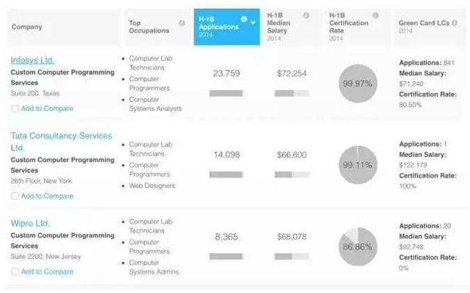 也就是说,2015年中,每100个申请H-1B签证的学生中有24位中签,这其中有16位印度人,中国人仅有2名。 同时,在H-IB申请人专业和雇主所处行业中,计算机相关专业位居首位,通过率高达64.5%。在美国findthedata.com网站对于H1B雇主的统计数据中,排名前三的均是计算机行业公司: