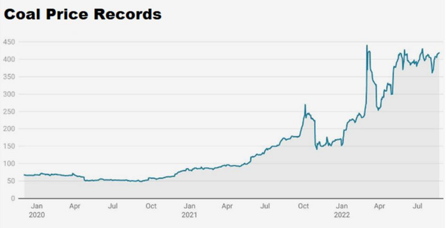 俄乌冲突爆发后,欧洲宣布禁运俄罗斯煤炭,直接扰乱了国际煤炭市场,引发国际煤价持续飙涨,从一年前的50美元/吨飙升至400美元/吨,最高涨幅一度超过700%。