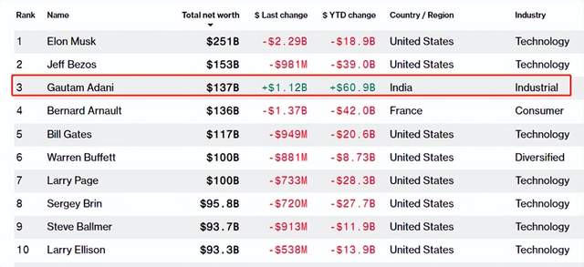 据彭博亿万富翁最新数据显示,塔姆·阿达尼的净资产达到1370亿美元(约合人民币9519亿元),超过奢侈品教父、LV总裁贝尔纳·阿尔诺,仅次于埃隆·马斯克、杰夫·贝佐斯,成为第一位闯入该榜单前三名的亚洲人。