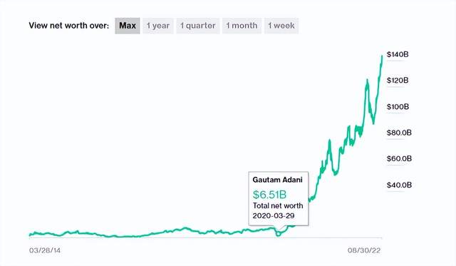 据彭博社的数据显示,自全球新冠疫情暴发以来,阿达尼的财富持续飙升,几乎呈现指数级增长。2020年年初,其个人财富净值仅为65亿美元,如今已升至1374亿美元,短短2年间的累计涨幅高达21倍。今年前8个月,便赚取了高达610亿美元(约合人民币4239亿元),成为了今年全球财富增长最快的亿万富豪。