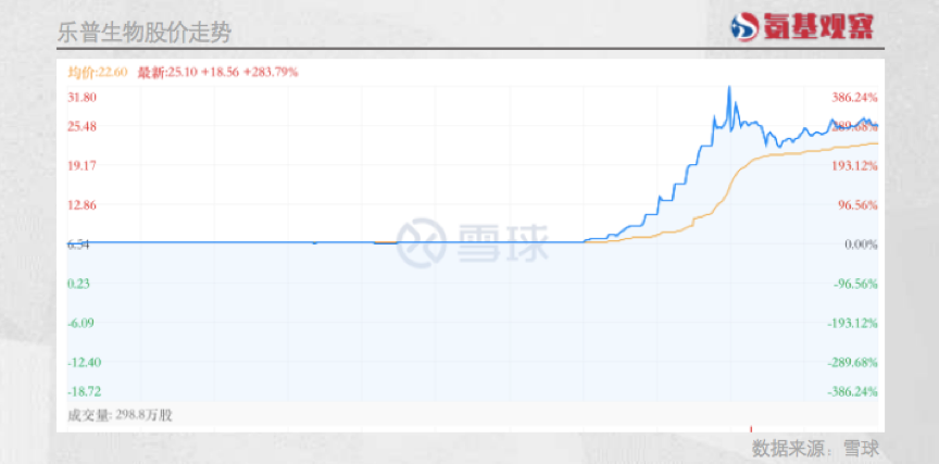 其中,表现最为出色的乐普生物,直接上演股价单日翻4倍的好戏:盘中最高涨幅达386%。随后股价虽然有所回落,但股价涨幅依然达283%。