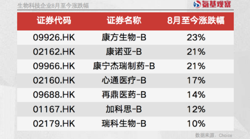 8月至今,在港股市场处于下跌趋势的情况下,包括瑞科生物、加科思、再鼎医药在内的近7家生物科技企业,股价涨幅接近或超过10%。其中表现最为突出的康方生物,区间涨幅达23%。