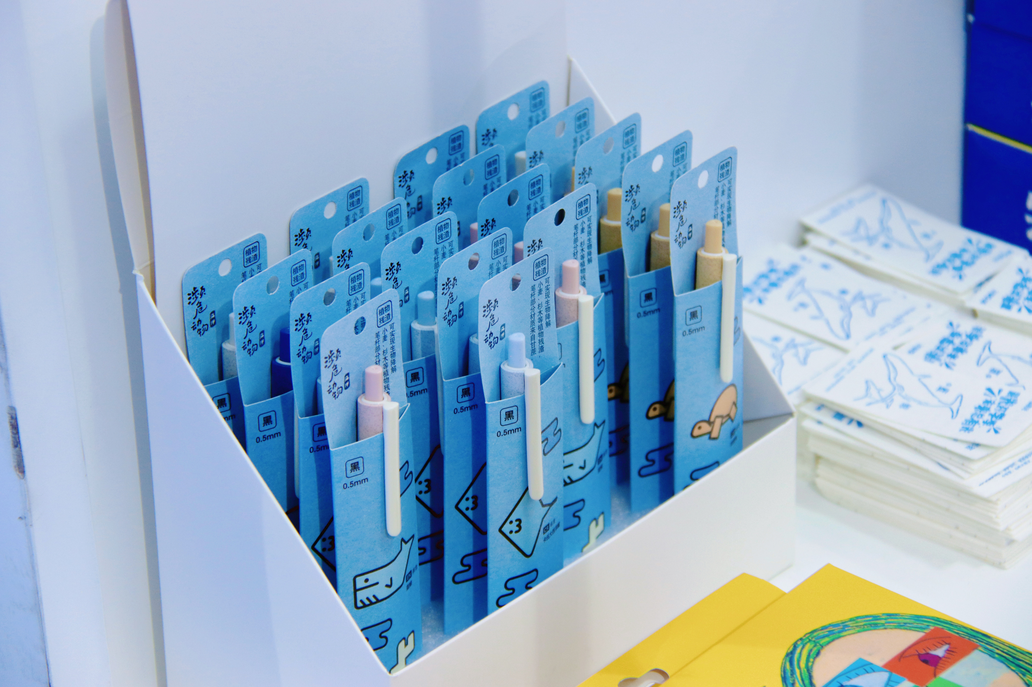 本次展出的“博物-濒危动物”海洋系列,将濒危海洋动物形象融入产品设计。其中的植物残渣中性笔,笔杆部分材质来自甘蔗、小麦、杉木等植物残渣,减少了不必要的塑料消耗。