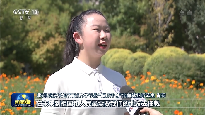 北京师范大学汉语言文学专业“优师计划”定向就业师范生 肖珂:总书记勉励我们增长传道授业解惑本领,在未来到祖国和人民最需要我们的地方去任教。我定不负嘱托,努力学习,在毕业后回到我的家乡。