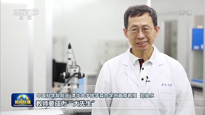 中国科学院院士 清华钱学森力学班首席教授 郑泉水:总书记说,“教师要成为‘大先生’,做学生为学、为事、为人的示范,促进学生成长为全面发展的人”。 我们牢记总书记的嘱托,以重大科技前沿领域的挑战性问题为牵引,引导学生树立人生的志向。同时,我们老师要牢记为党育人、为国育才这一重要使命,努力成为学生的榜样。