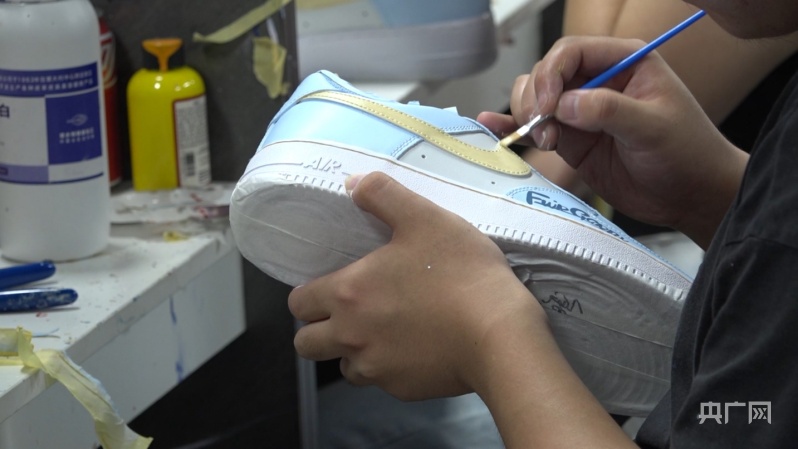电脑设计、手绘、封釉、烘烤,不一会儿,一双品牌鞋子就完成了个性化改造,并很快进入流通环节。因为有了独一无二的设计,鞋子在线上受到了年轻人的追捧,而它的价格也水涨船高……