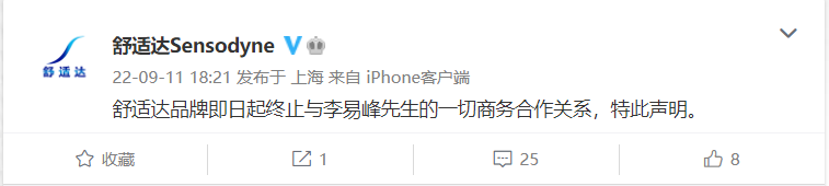 9月11日晚间,@舒适达Sensodyne 官微宣布,即日起终止与李易峰的一切商务合作关系。