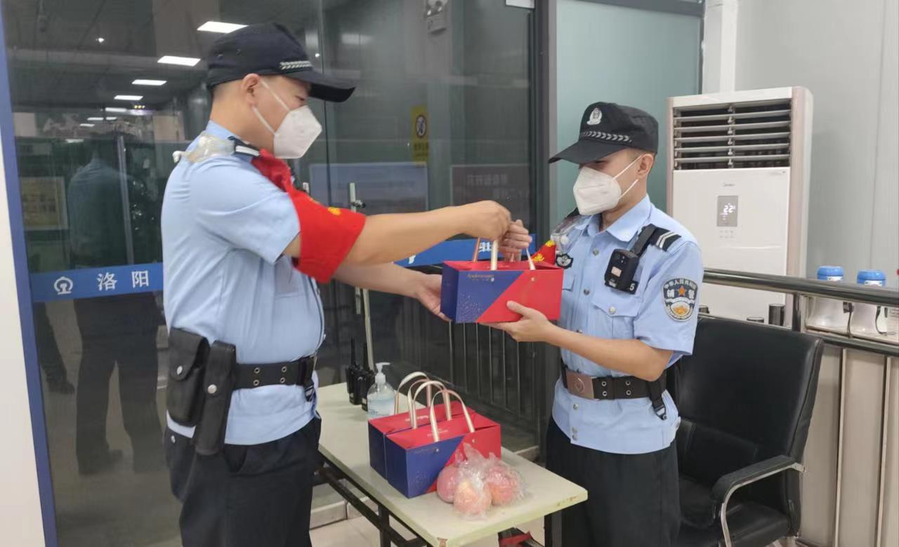 巡查过后,值班领导代表所支部亲手给各岗位执勤人员送上了月饼、水果、酸奶等慰问品,和洛阳站派出所这个大家庭的成员们一起度过这个团圆的节日。值班的民警、辅警们也纷纷表示,会认真值好每一班岗,守护好辖区内的治安稳定,帮助旅客们安全返乡,度过一个圆满的中秋佳节。