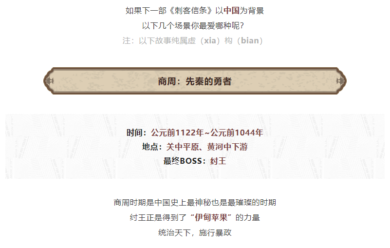 2018年时,“UBISOFT育碧”公众号发布过一篇推文,询问粉丝“如果下部《刺客信条》在中国”应该选用哪个朝代,并有模有样地设计了“商周:先秦的勇者”、“秦朝:混乱中的秩序者”、“隋唐:盛世下的刺杀者”、“明代:暗流涌动的守护者”四个选项。