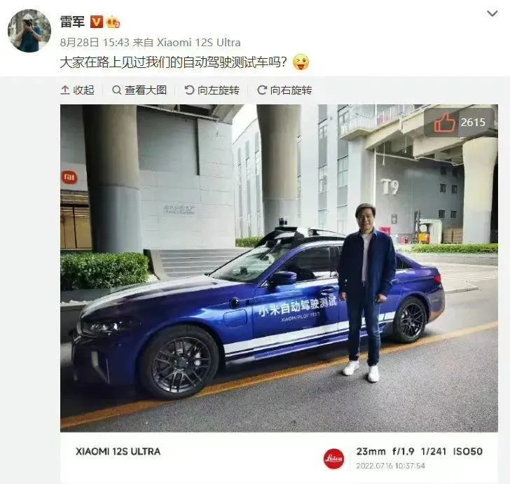 对此,小米创始人雷军,也在其微博发文:“大家在路上见过我们的自动驾驶测试车吗?”,还附上自己和一台小米自动驾驶测试的车的照片,不过图片中的这台车并非小米自家的车型,而是套用了宝马5系的车体。