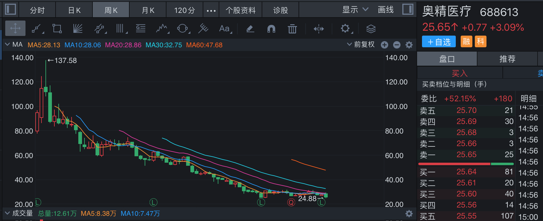 自2021年5月21日上市以来,奥精医疗从16.43元发行价,一路冲到了137.58元的高度,用时短短8个交易日。但此后,股价拐头向下,并一路跌到现在,最低下摸24.88元的位置,区间最大累计跌幅超过了80%。截至2022年9月9日的收盘价为25.65元。