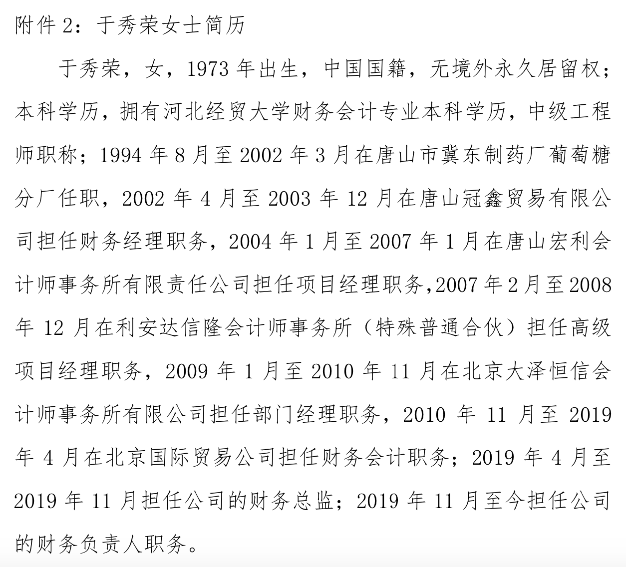 于秀荣在奥精医疗里职务多变,公开信息显示,其先是2019年4月至2019年11月担任公司的财务总监。奥精医疗那时正在IPO进程中。财务总监,对公司来说自然是相当重要的岗位。来之前,于秀荣还在多家公司待过。