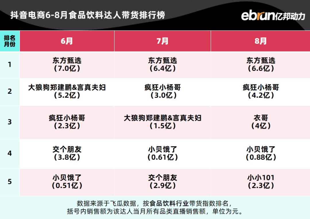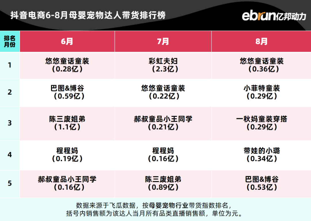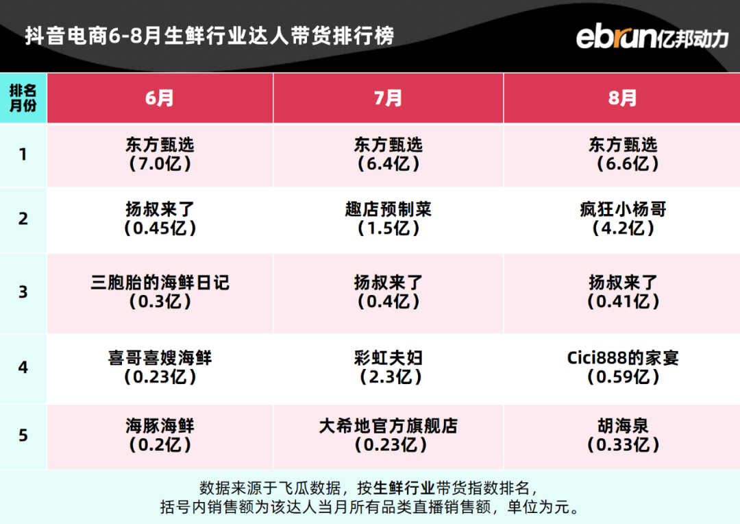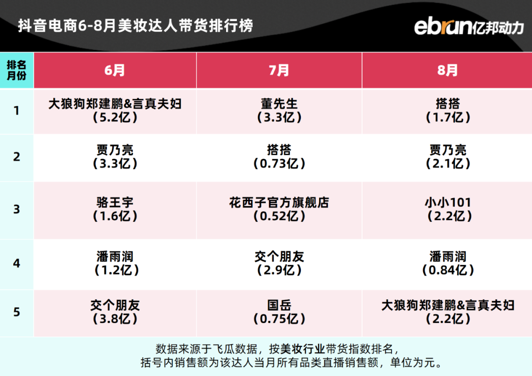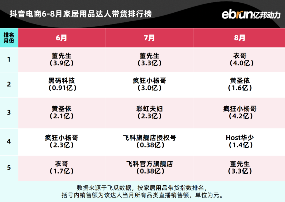 亿邦动力盘点发现,今年1-8月抖音电商达人带货榜TOP10基本定型。