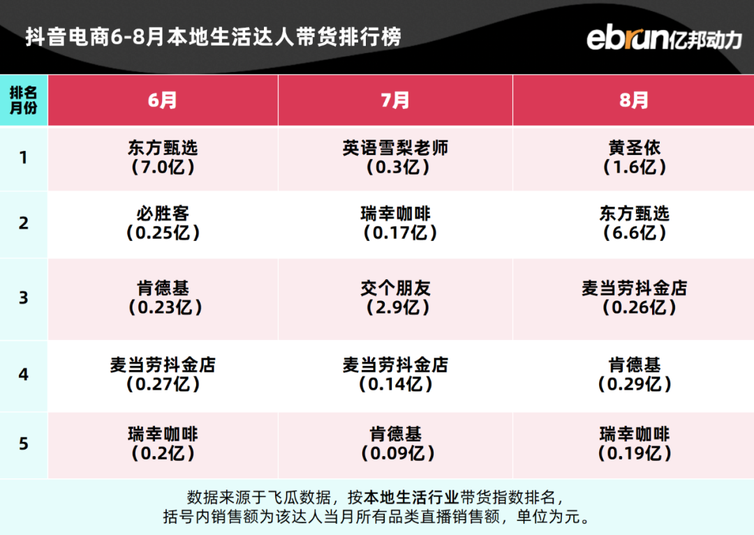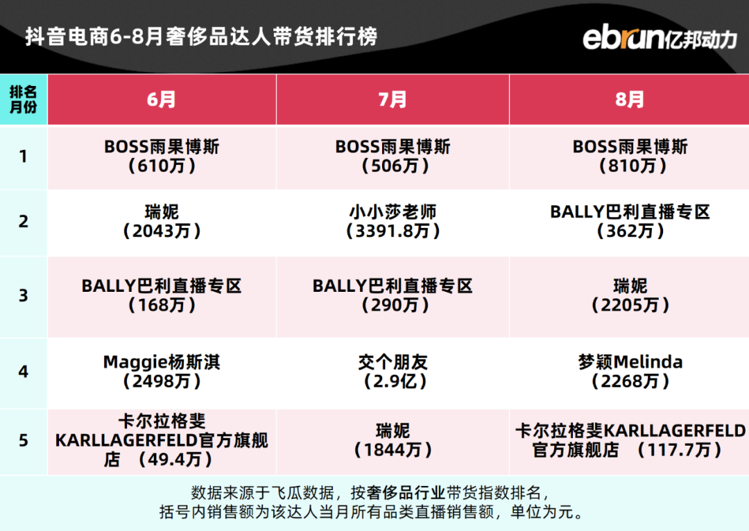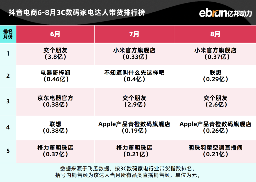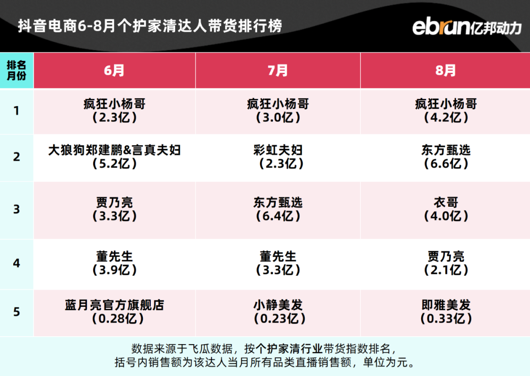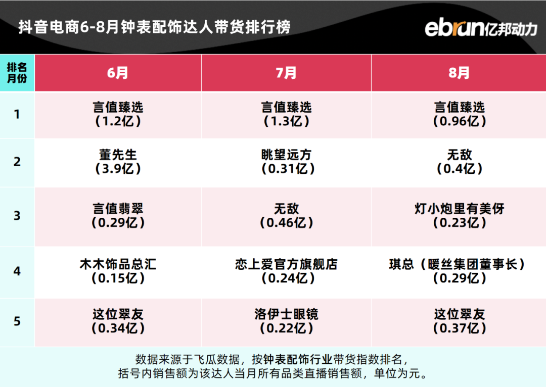 亿邦动力盘点发现,今年1-8月抖音电商达人带货榜TOP10基本定型。
