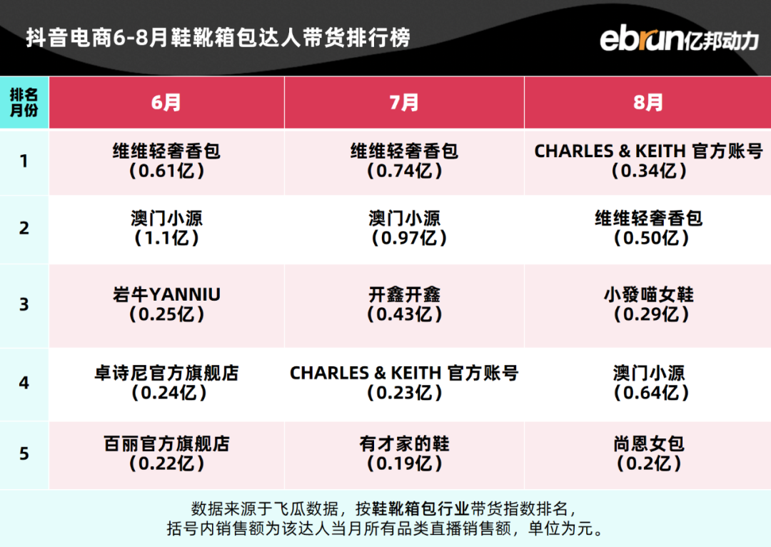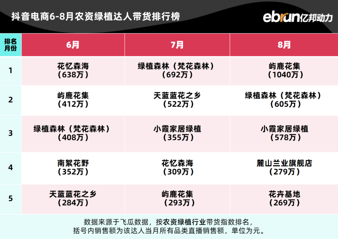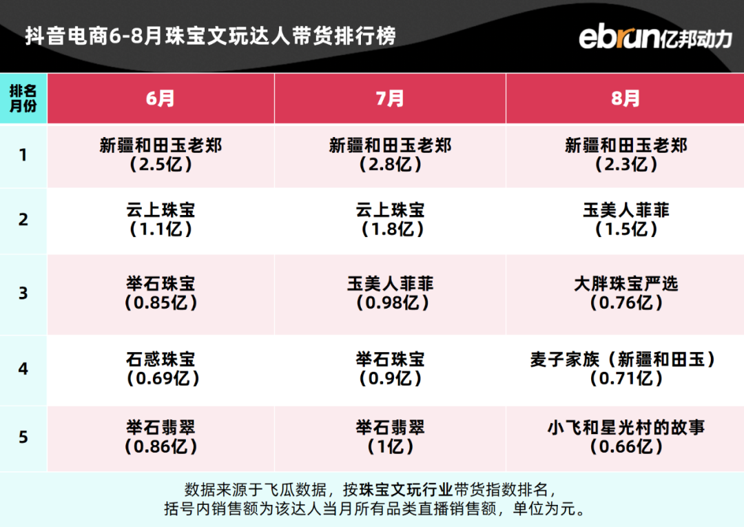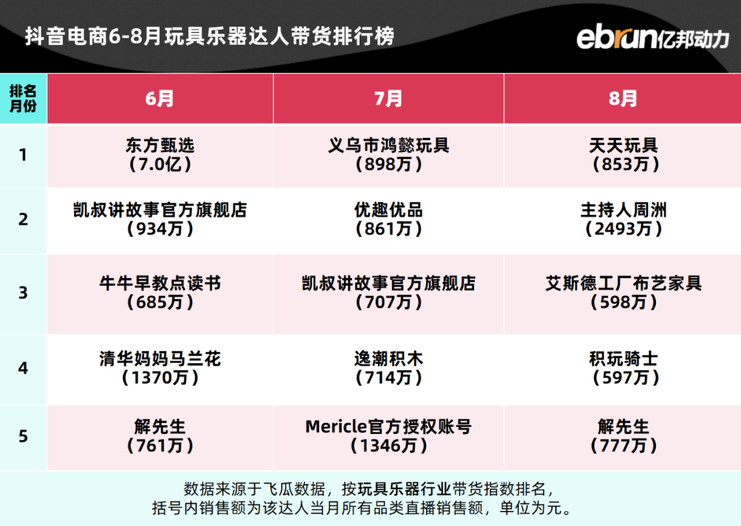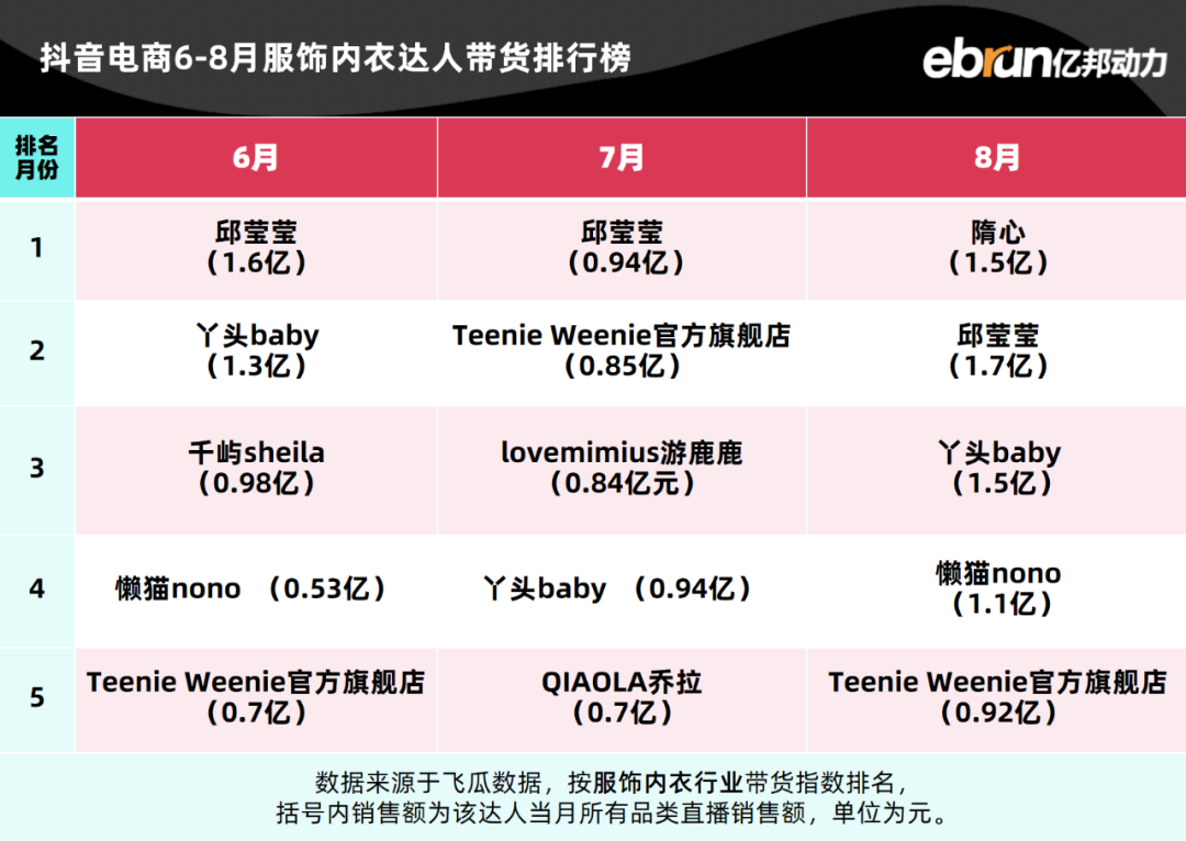 亿邦动力盘点发现,今年1-8月抖音电商达人带货榜TOP10基本定型。