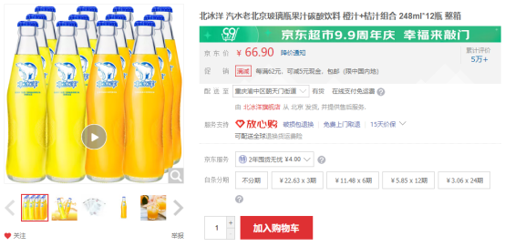 此外,550ml大瓶装的大窑汽水,定价却与其他240ml的国民饮品差不多。比如京东上,大窑汽水玻璃瓶装520ml*12瓶售价64.90元,而北冰洋玻璃瓶装248ml*12瓶价格就达66.90元。