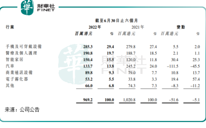 其中影响最大的是汽车领域的业务,报告期内,公司来自汽车行业的收入同比下降45.5%至1.34亿港元,由去年的第二大业务下跌至第四大业务。此外,手机及可穿戴设备、医疗及个人护理整体上受经济大环境影响亦不小,期内该两块业务的收入只录得小幅上升。