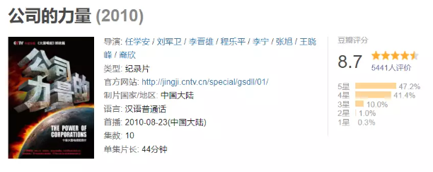 首播于2010年的《公司的力量》,由《大国崛起》的总导演任学安率原班人马,历时两年、跨越八国、实地拍摄数十家公司、采访百余位中外学者创作而成。