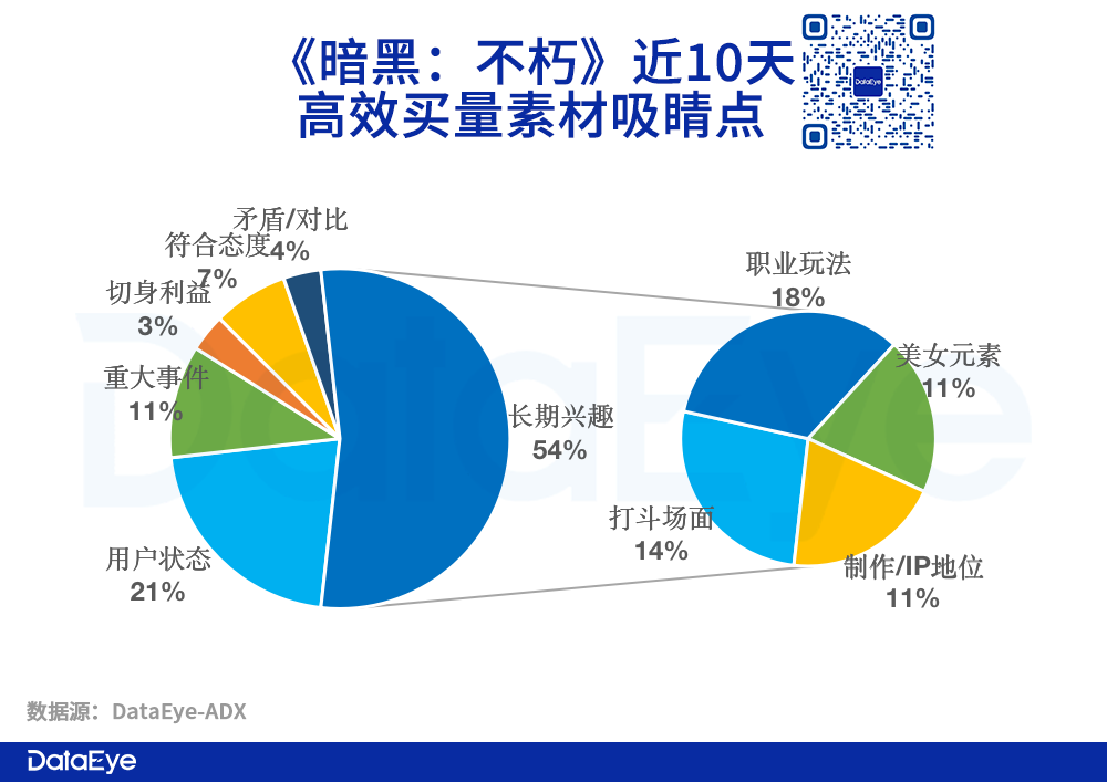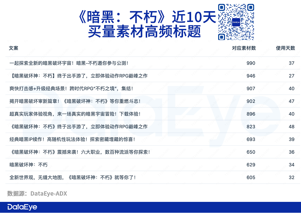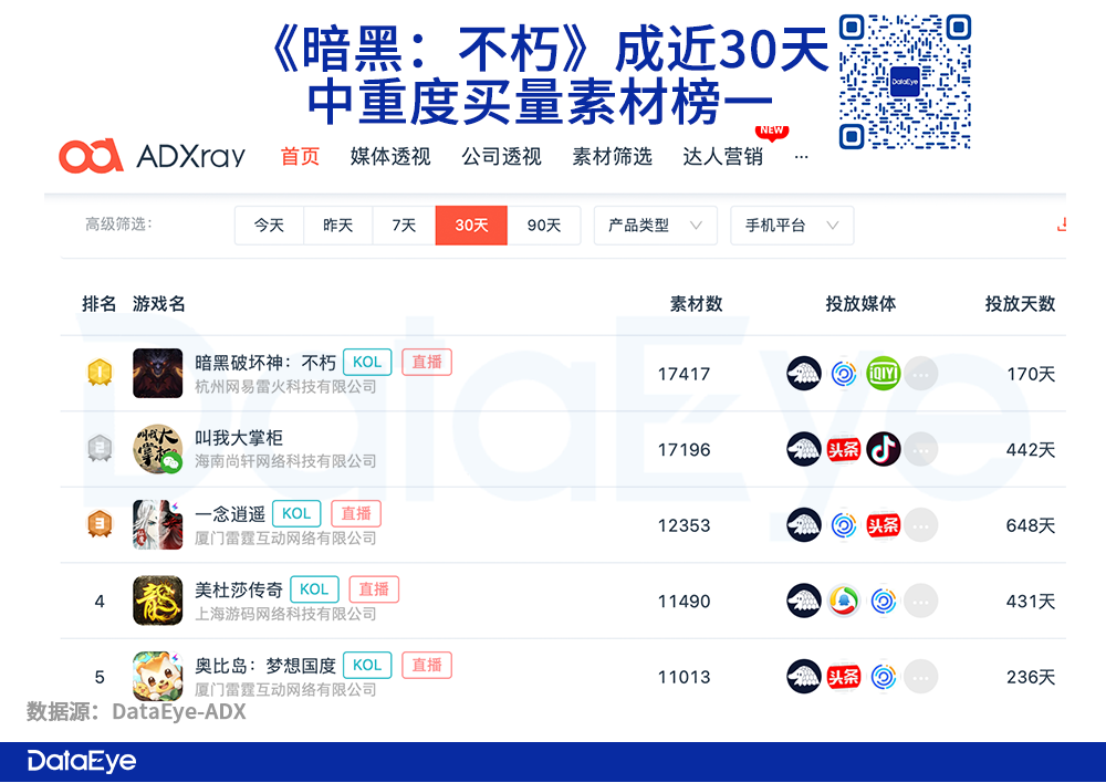 连续约半个月《暗黑:不朽》的单日素材量都在2800+(DataEye研究院听说光素材包都接近10个G)。最近30天,该游戏也夺得了中重度游戏买量素材榜第一。