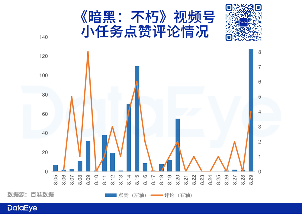 百准数据显示:《暗黑:不朽》小任务共吸引22名达人投稿的88个视频,共计512个赞、42条评论,主要是活动攻略、游戏经历类,真人拍摄的极少。其中@王一博yydsii一条视频有126个赞,是数据最好的视频。(特别鸣谢:百准数据,一家微信视频号数字营销及产业服务平台)。