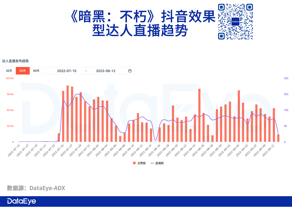 DataEye-ADX数据显示:7月23号以来,《暗黑:不朽》就持续推进达人直播。近30天,抖音达人直播次数维持每天50-150场,力度中等、持续坚持,但波动较大。按照直播场次算《暗黑:不朽》位列抖音达人直播榜第30位,按最高在线人数算则排到47位。