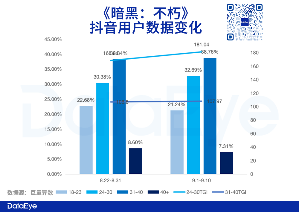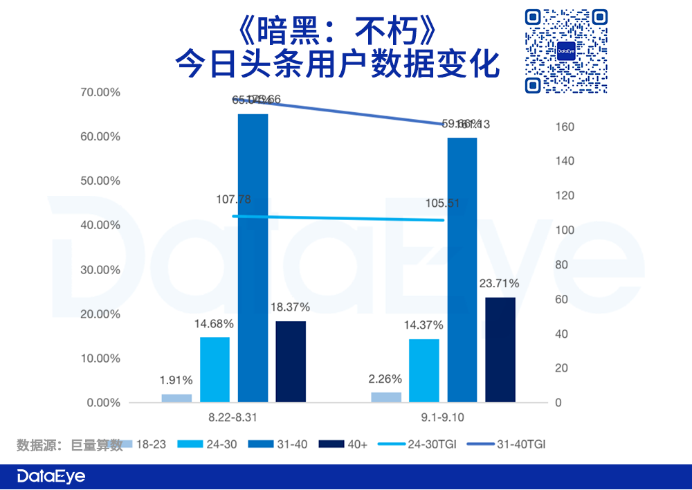 2、从撬动的用户来看:抖音的中青年增加:9月1号至10号24-30岁用户的占比与TGI相比前十天的数据略微提升;今日头条的中老年用户增加:40岁+用户占比大幅提升。(华为IP奏效了?)
