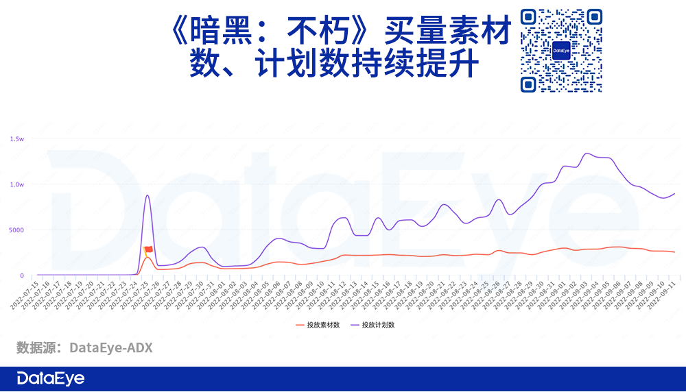 8月末开始的此后半个月,《暗黑:不朽》买量素材就持续在稳步提升。而投放的次数(计划数)快速提升。这说明:持续增加的广告素材,在被尝试用越来越多的方案多次投放。