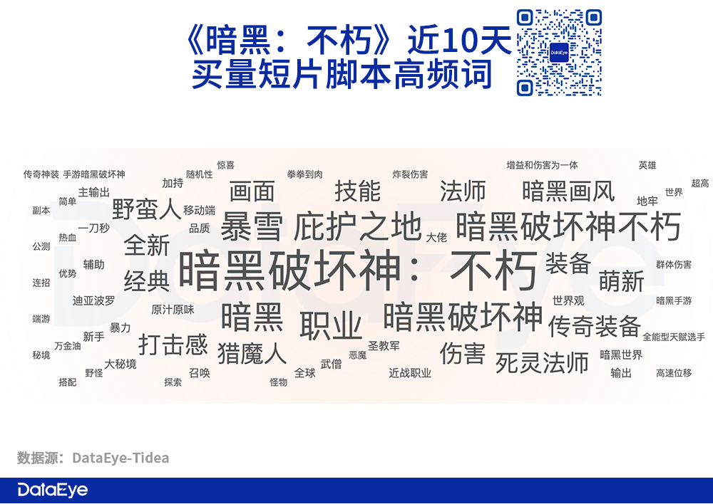 除了提到“暗黑破坏神”IP名以外,脚本文案及标题更多地提到了“体验”、“RPG”、“打击感”、“画面”、“装备”、“职业”等围绕游戏本身的词汇。此外,“巅峰之作”、“拳拳到肉”、“伤害”等高频词也被项目组用来间接体现游戏品质、体验。