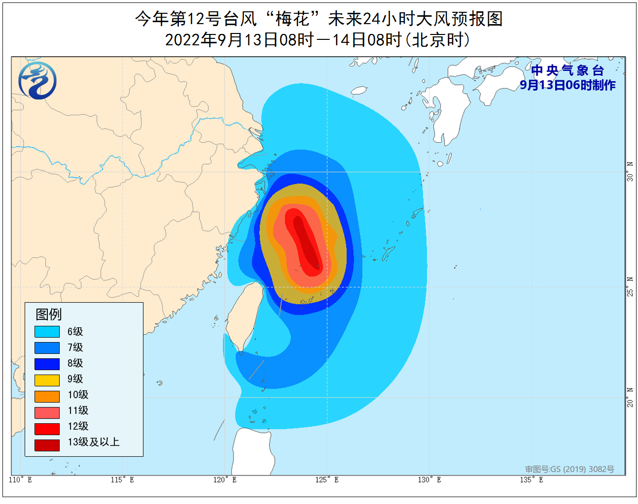 中央气象台同时发布大风预报称,9月13日8时至14日8时,巴士海峡、台湾海峡北部、台湾以东洋面、黄海西南部海域、东海大部及钓鱼岛附近海域、长江口区、杭州湾以及台湾岛北部和东部沿海、浙江沿海、福建北部沿海、上海沿海、江苏东南部沿海将有6-8级大风,阵风9-11级,其中东海部分海域将有9-11级大风,阵风12-14级,“梅花”中心经过的附近海面的风力有12-14级,阵风可达15-16级。