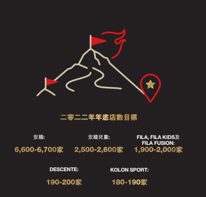 安踏在财报中透露出今年的开店目标,旗下安踏主品牌门店数目标6600~6700家,安踏儿童要达到2500~2600家的规模,FILA(包括FILA、FILA KIDS、FILA FUSION)门店目标1900~2000家,高端运动品牌DESCENTE迪桑特要扩张至190~200家,KOLON SPORT目标180~190家门店。