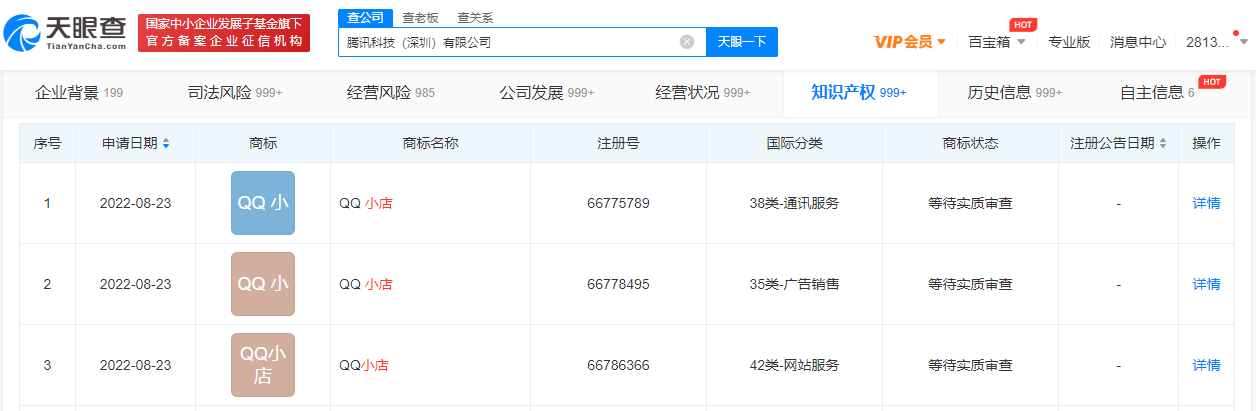 天眼查App显示,8月23日,腾讯科技(深圳)有限公司申请注册多个“QQ小店”商标,国际分类涉及广告销售、通讯服务等,当前商标状态均为等待实质审查。