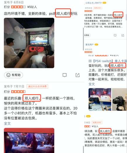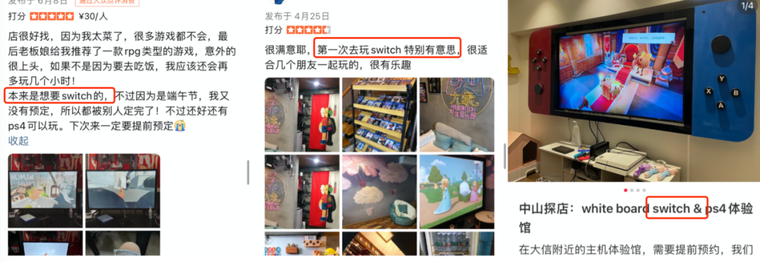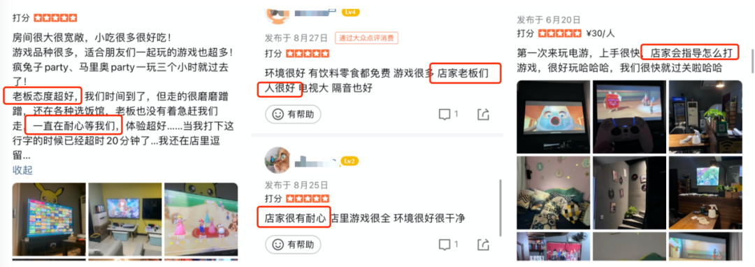 在B站和小红书上,许多店主用上了“推广”“科普”“教育”等词语,就像王者荣耀曾帮助大众了解MOBA类游戏,主机店的出现也帮助大众走入主机游戏的世界。打开点评软件的用户评论,比起店里是否有最新版的游戏,或游戏是否能联网,更常出现在评论中的是主题房的设计、服务质量、沙发舒适度、零食饮品的选择、环境卫生这些因素。