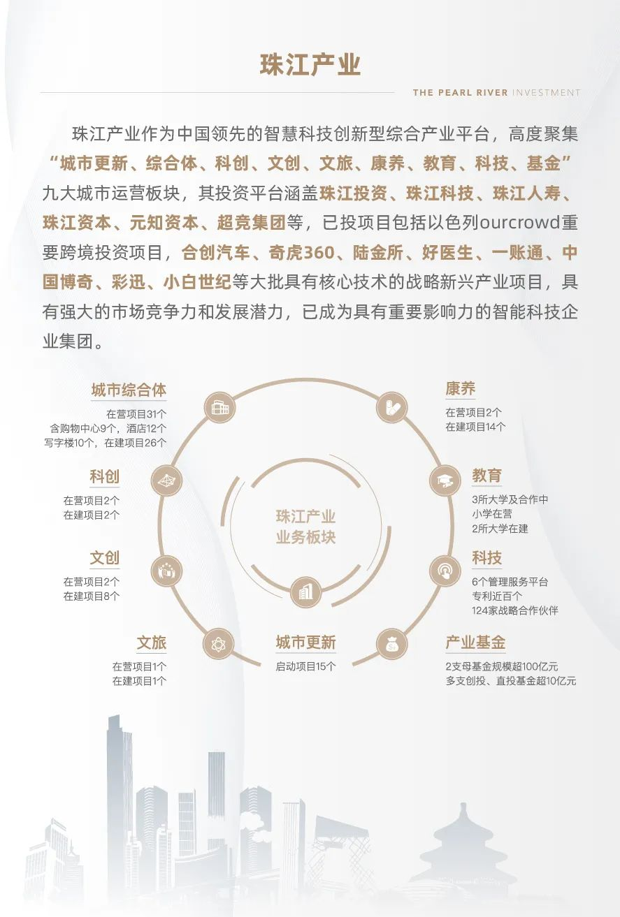 珠江产业作为中国领先的智慧科技创新型综合产业平台,高度聚集“城市更新、综合体、科创、文创、文旅、康养、教育、科技、基金”九大城市运营板块,其投资平台涵盖珠江投资、珠江科技、珠江人寿、珠江资本、元知资本、超竞集团等,已投项目包括以色列ourcrowd重要跨境投资项目,合创汽车、奇虎360、陆金所、好医生、一账通、中国博奇、彩迅、小白世纪等大批具有核心技术的战略新兴产业项目,具有强大的市场竞争力和发展潜力,已成为具有重要影响力的智能科技企业集团。