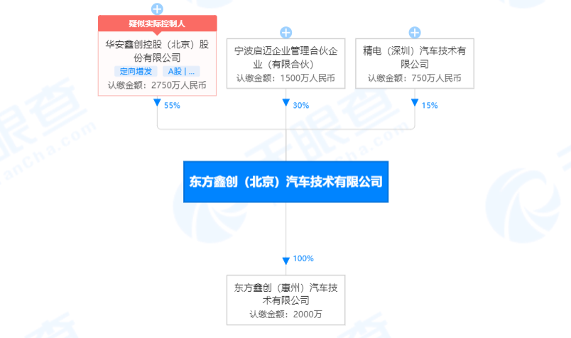 9月13日消息,天眼查App显示,近日,东方鑫创(惠州)汽车技术有限公司成立,法定代表人为何金彪,注册资本2000万,经营范围包括信息系统集成服务;集成电路设计;智能车载设备销售;集成电路芯片及产品销售;工业互联网数据服务;数据处理和存储支持服务等。股权穿透图显示,该公司由华安鑫创控股(北京)股份有限公司、宁波启迈企业管理合伙企业(有限合伙)精电(深圳)汽车技术有限公司间接持股。