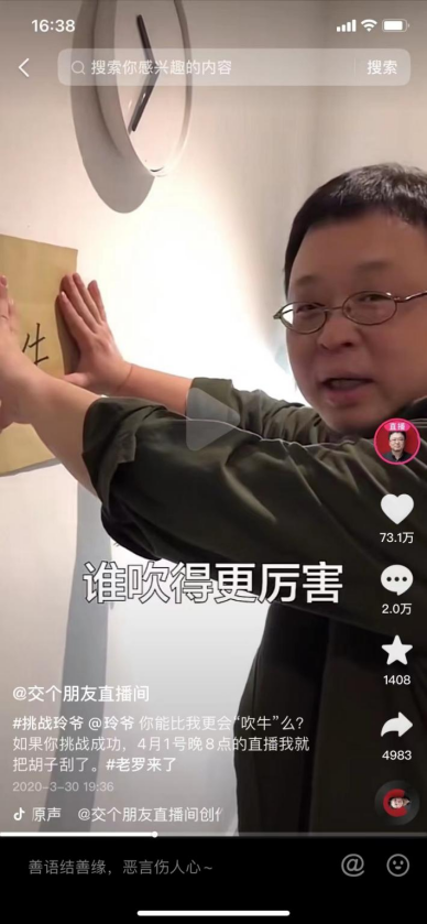 罗永浩联动了企业家、品牌方、KOL等多方势力,全维度为自己造势,在抖音形成持续性热点事件讨论。比如,罗永浩向粉丝千万的抖音大V“玲爷”发起“吹牛”挑战,该条视频收获73.1万点赞,2万评论,以及无数网红的跟风模仿。